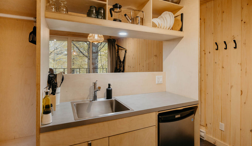 Ce micro-refuge en nature offre une vue imprenable sur la forêt environnante et peut accueillir jusqu'à 6 personnes grâce à un lit double coulissant à l'intérieur et une petite cabine supplémentaire à l'extérieur*. Le design minimaliste de ce refuge optimise l'espace disponible pour offrir un espace de vie confortable tout en restant connecté à la nature.
